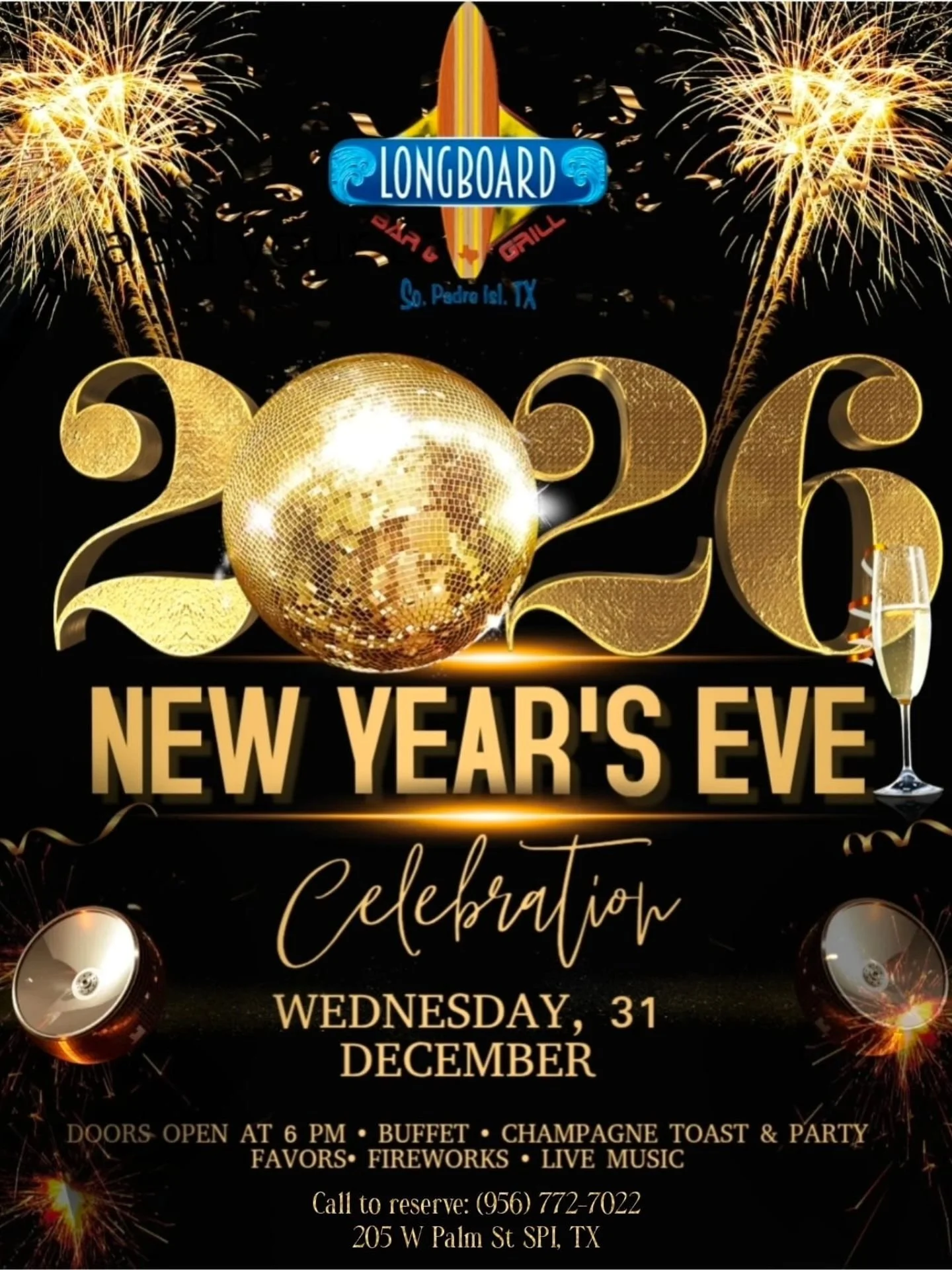 Ring in 2026 with us! LongBoard Bar & Grill on South Padre Island invites you to a spectacular New Year's Eve celebration right here on the waterfront!